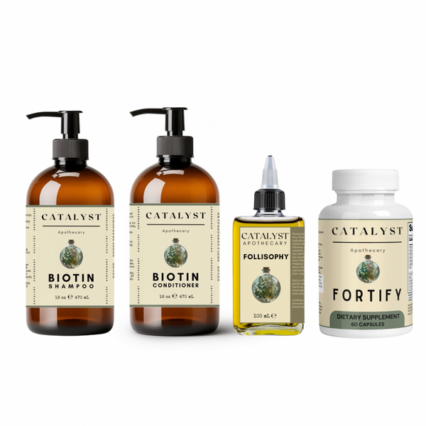 The Essentials Kit embodies the “Refresh, Invigorate, Nourish” philosophy with a holistic approach to scalp and hair health, featuring Biotin Shampoo, Biotin Conditioner, Follisophy Hair Oil, and Fortify for rejuvenation and comprehensive care.